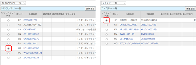 - 同一ファミリーの案件が複数同時に取り込まれた場合、ファミリーの代表は、JP⇒US⇒WO⇒EP⇒CNの順で自動付与されます。時間差で取り込まれた場合、最初に付与された代表が変わることはありませんが、全件再取り込みした場合は、上記の順で再度付与されます。