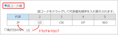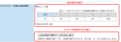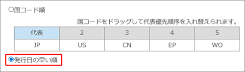 ファミリー代表特許の優先順序を国コードまたは発行日順で指定することができます。