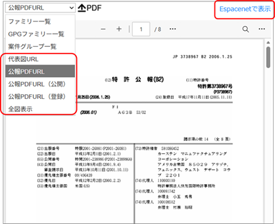 また、代表図、公報、全図を設定した時、「Espacenetで表示」リンクが生成される場合(※)は、該当案件をEspacenet(別画面)で表示することができます。