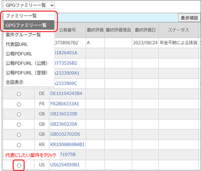 ファミリー(GPGファミリー)代表を変更したい時は、ファミリー(GPGファミリー)一覧を表示し、代表にしたい案件の代表列をクリックしてください。保存して変更完了です。