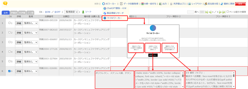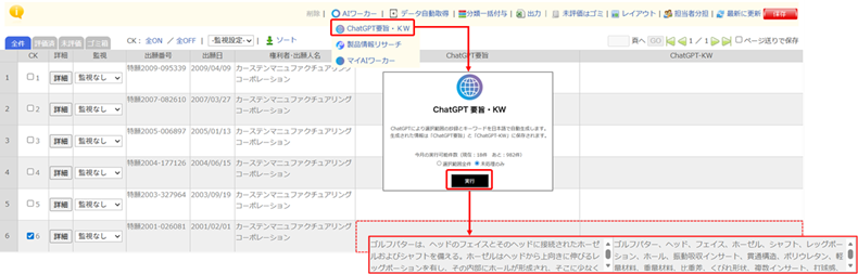 ChatGPTを使用して、「発明の名称」「要約」「請求の範囲」のデータを元に「要旨」「キーワード」を生成します。